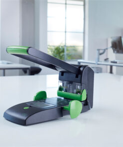 Moćan blok perforator 2-u-1 za bušenje dve i četiri rupe do 200 listova papira. Bušač je potpuno metalan sa plastičnim kuc´ištem napravljenim od održivih recikliranih materijala.